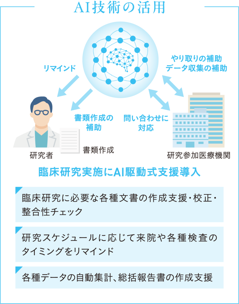 「Kyoto NEXT」プロジェクトでは、特に臨床研究の推進においてAI技術の積極的な活用を試みます。具体的には、AI駆動式臨床研究事務局の実現を目指し、臨床研究に必要な各種文書の作成・校正・整合性チェックの機能、被験者の組み入れ時点から計算されるスケジュールに合わせて来院や各種検査をリマインドする機能、各タイミングに合わせて参加施設に連絡メール(事前連絡、督促、注意喚起、等)を送信する機能、データクリーニングの機能、各種データを自動的に集計する機能、総括報告書を半自動的に作成する機能等、様々な側面でAIを活用します。
