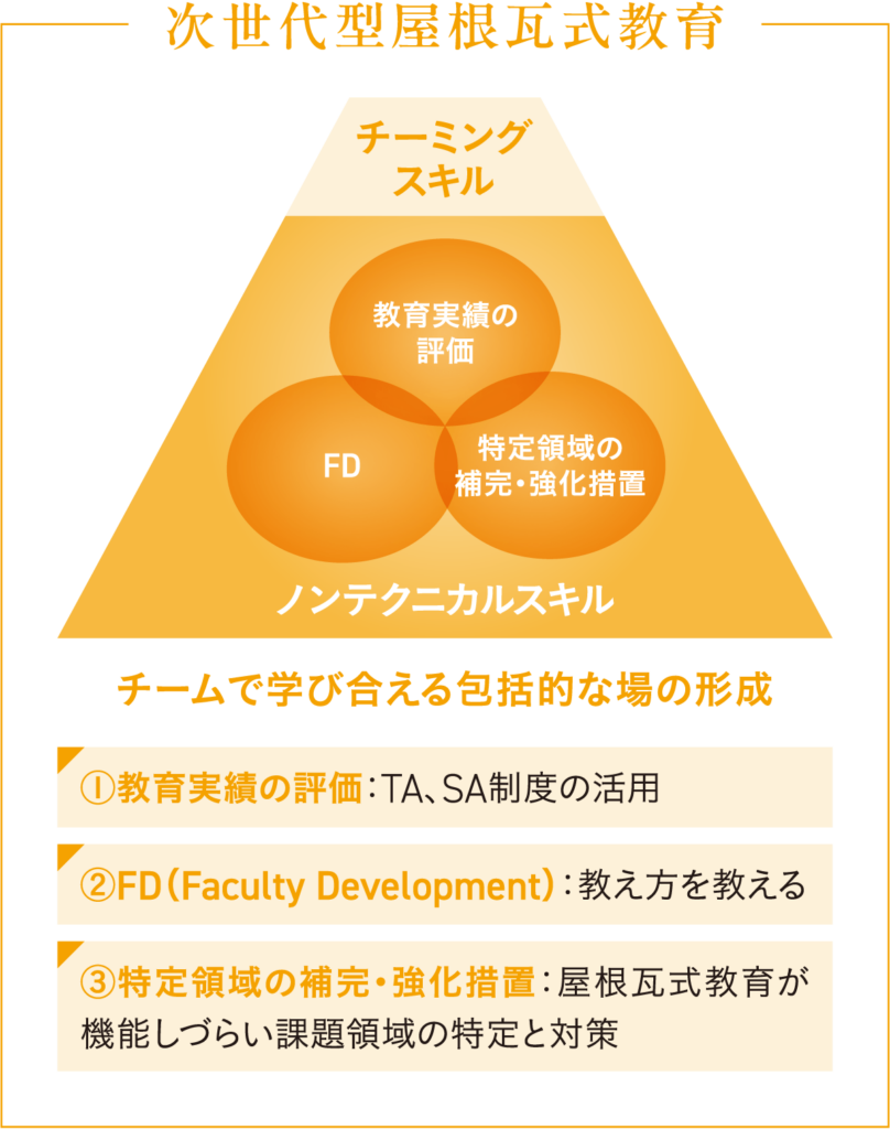 そこで本事業では、TA(ティーチングアシスタント)、RA(リサーチアシスタント)、SA(スチューデントアシスタント)を制度として運用し、組織のバックアップを受けたシステムとしての次世代型屋根瓦式教育を構築します。また、非常に重要な要素として、「教育を行うための教育」の機会を提供します。これは昨今、指導者・教員を中心にFD(Faculty Development)として重視されているものですが、これをTA、RA、SAといった早い段階で受けることで、屋根瓦式教育をサポートします。さらに屋根瓦式教育の短所として「教えられたことしか教えられない」という点があり、以前重視されていなかった教育内容等について手薄になるという点がありますので、この点についての補完的な取り組みも行っていきます。